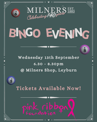 Our Bingo Evening kicks off at 6.30pm on Wednesday 13th September and will finish up at 8.30pm. Limited tickets for the event, as well as raffle tickets, can be purchased in store, and don’t forget to bring your bingo ticket with you on the night for a stamp to grant you 20% off your next purchase at Milners!